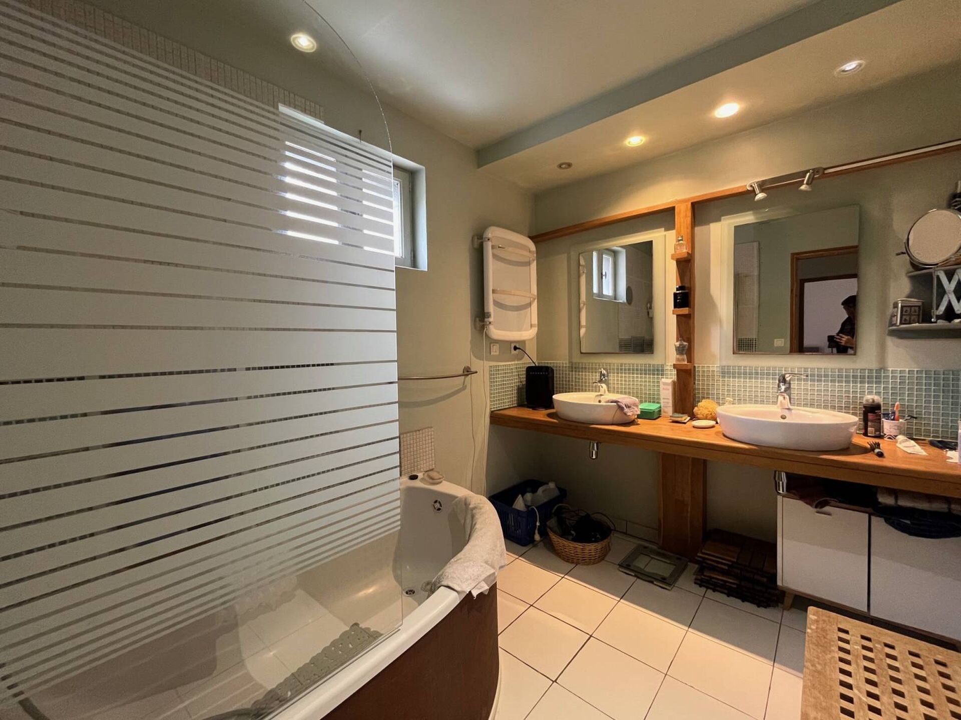 A l'étage : 3 chambres et une salle de bains avec une double vasque.
